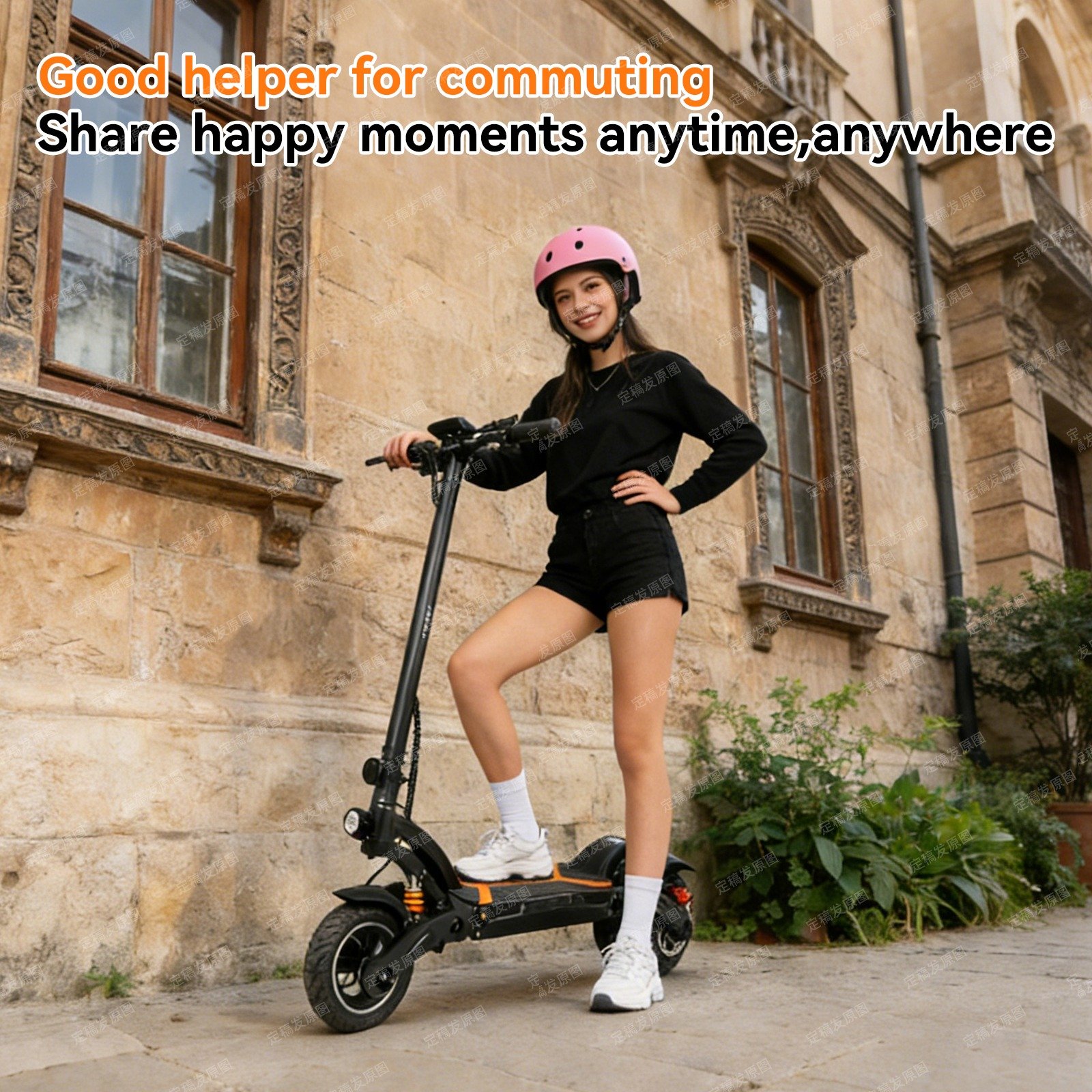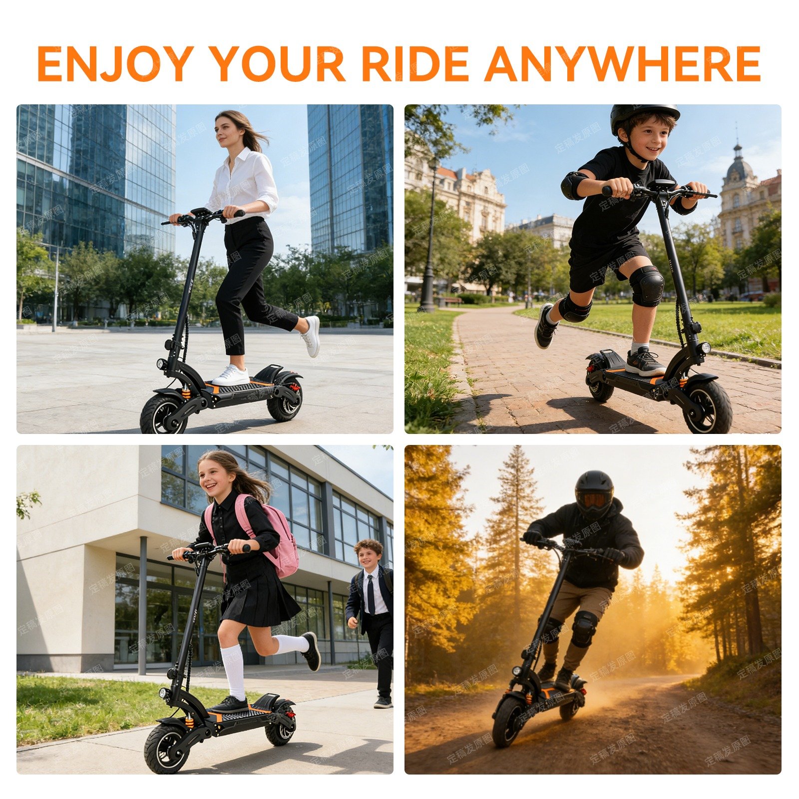 Features 10-inch pneumatic tires and shock absorption system for smooth riding even on rough surfaces.